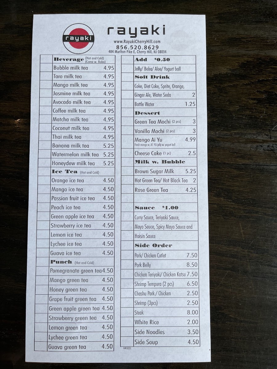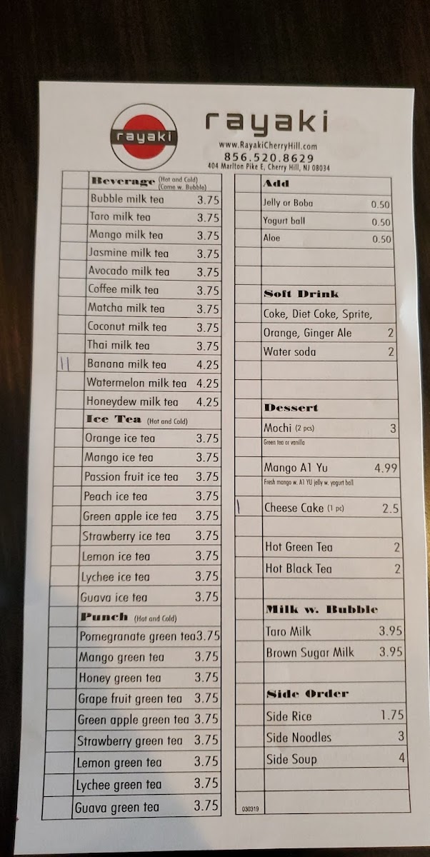 Complement your meal with refreshing beverages like Mango Milk Tea or Avocado Milk Tea. With glowing customer reviews emphasizing excellent service and an enchanting atmosphere, Rayaki Ramen Cherry Hill is sure to be your next ramen haven.